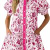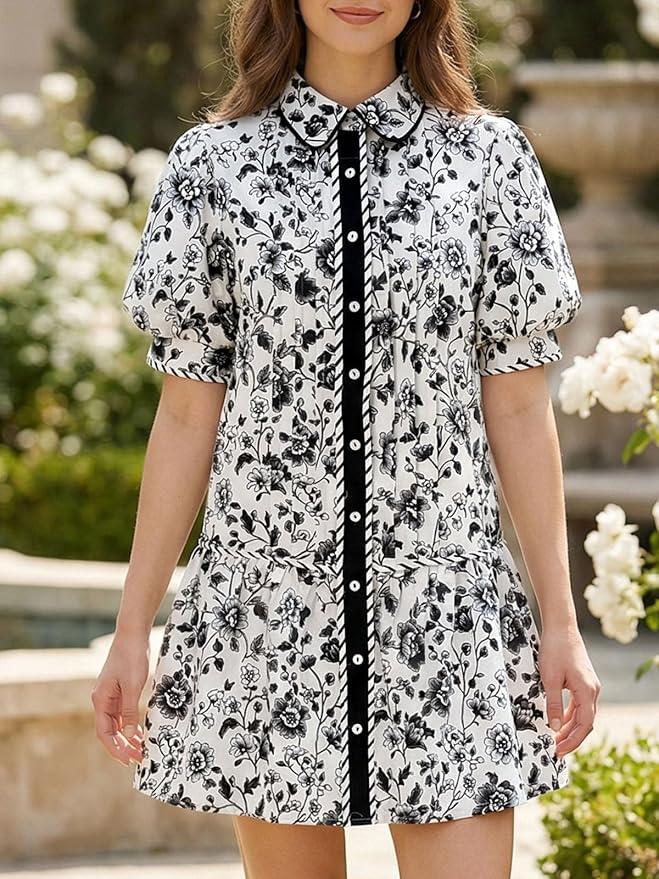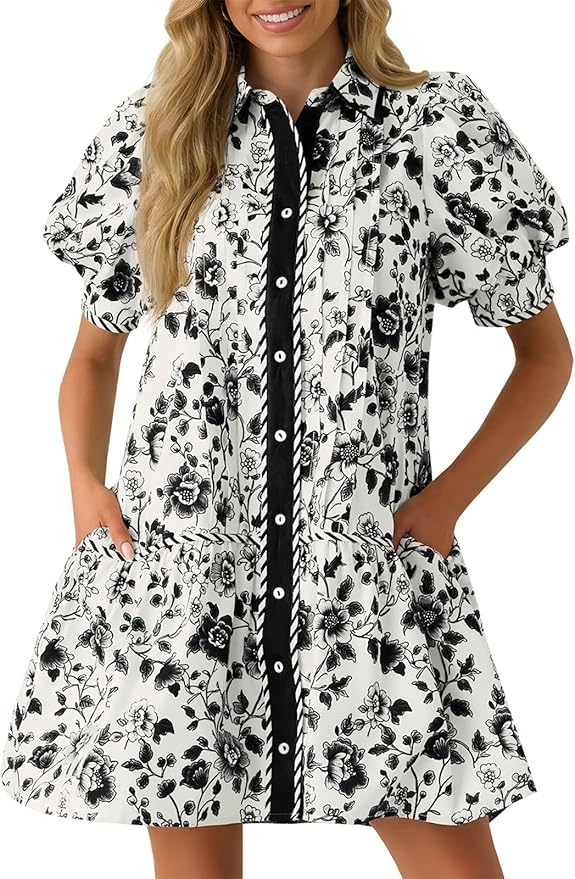 - Dress Design: Features a collared V-neck, floral design, short puff sleeves, and full front buttons. Loose shirt-dress cut with side pockets and a low waistline for a flattering, casual look.