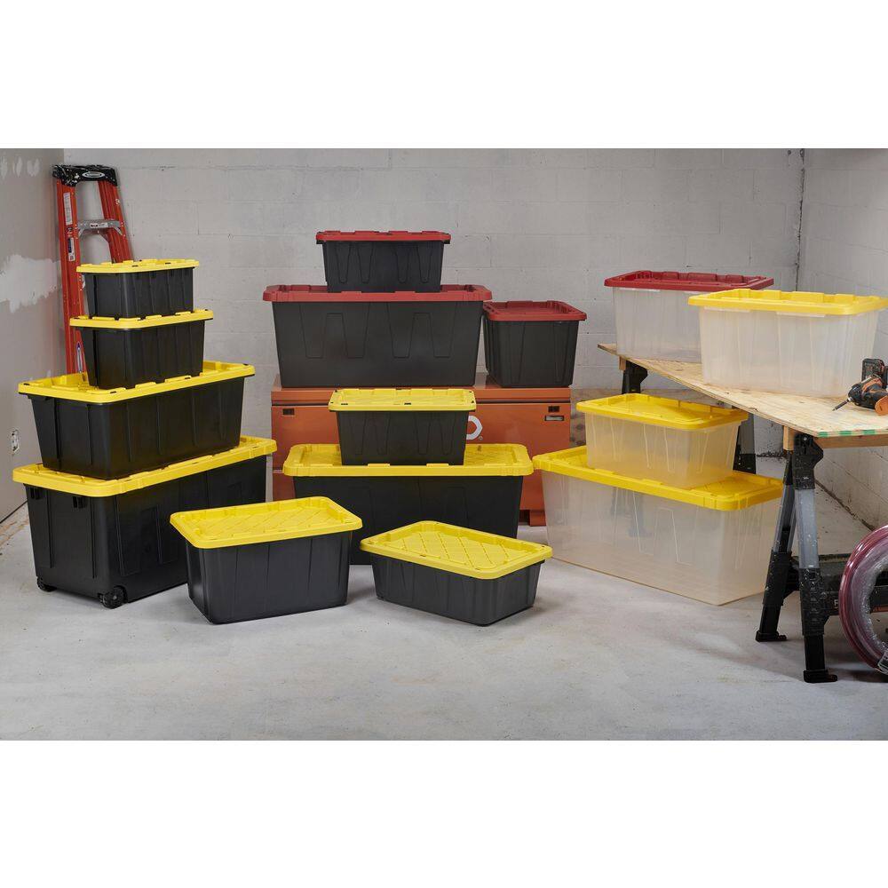 HDX 27-Gallon Black Storage Tote with Yellow Lid, Stackable & Waterproof, 5-Pack