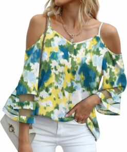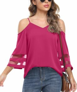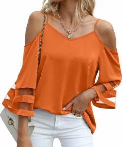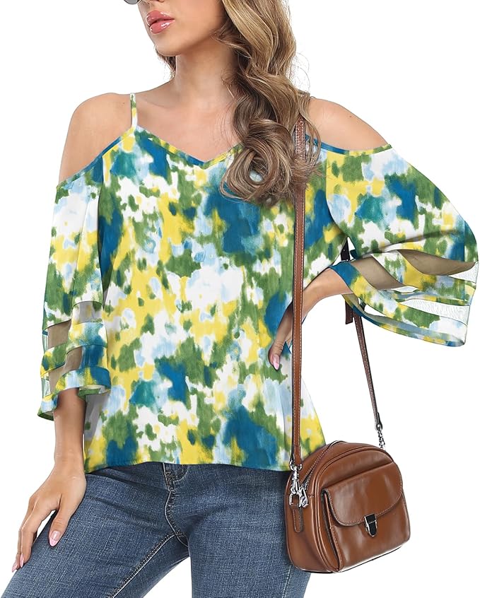 - Features:Cold shoulder,adjustable spaghetti strap,v neck and mesh panel 3/4 bell sleeve design blouse,loose blouse in a relaxed fit.