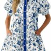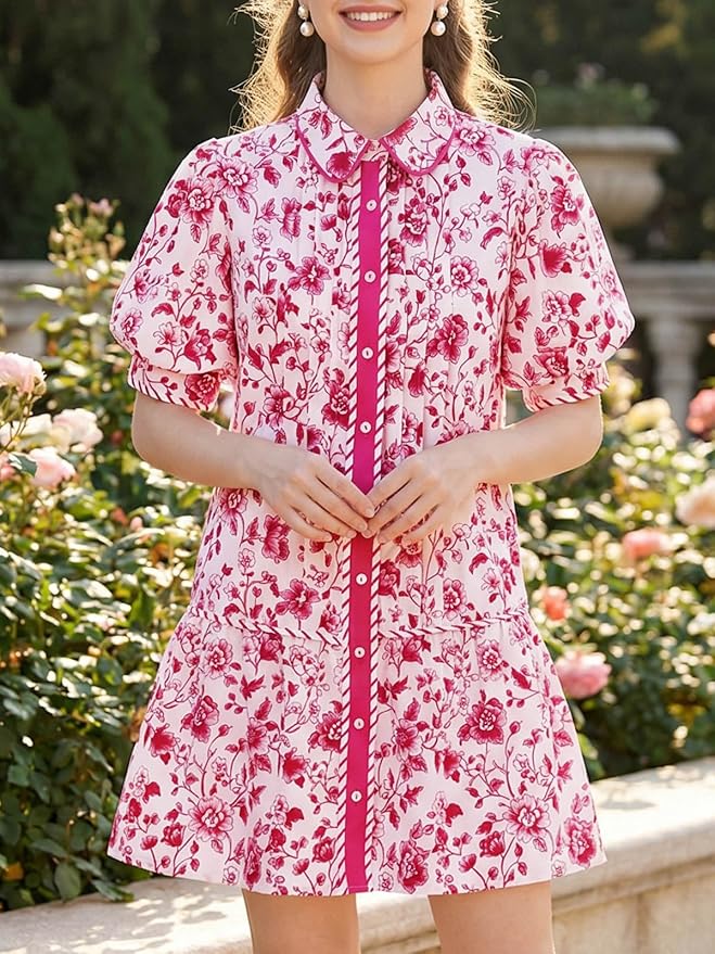 - Dress Design: Features a collared V-neck, floral design, short puff sleeves, and full front buttons. Loose shirt-dress cut with side pockets and a low waistline for a flattering, casual look.