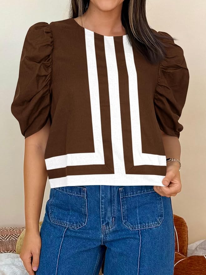 - Stylish Design: Featuring a trendy striped color block pattern and a round neck design, these cute cropped shirts never go out of style. The pleated puff short sleeves add a fashionable touch, allowing you to flaunt your style effortlessly