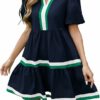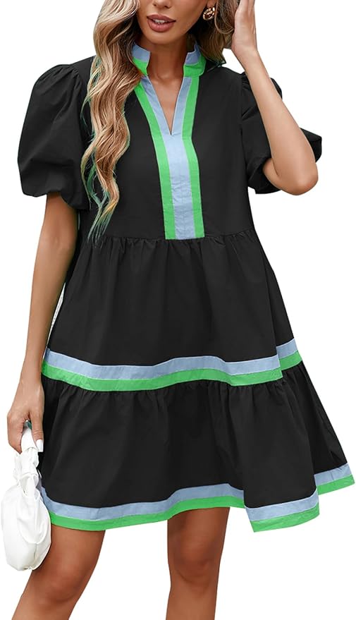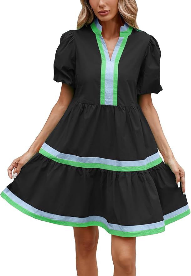 - Feature: This navy blue mini dress features a notch v-neckline, short puff sleeves with elastic cuffs, functional pockets,tiered skirt,high waist,casual,a line,stand collar and green and white stripe design