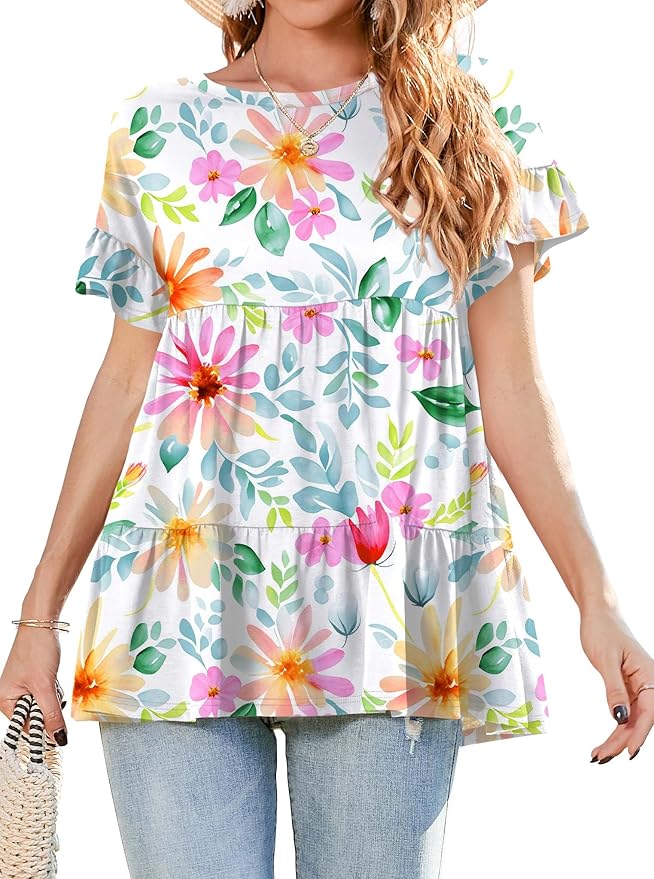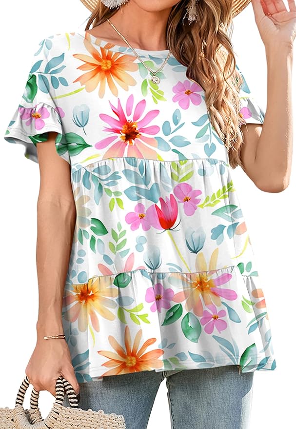 - Cute shirts for women features Ruffle Hem Design, Round Neck, Loose Style, Ruffle short Sleeve, Casual loose fit, flattering and stylish!